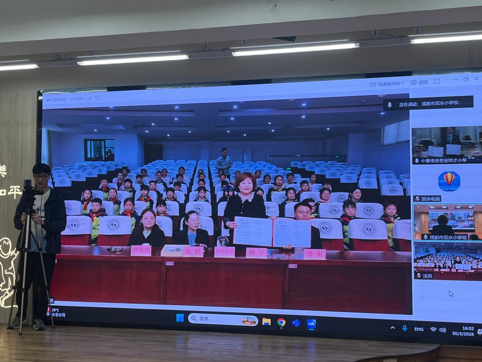 本校於3月30日(星期一)與成都市雙水小學以視像形式舉行締結儀式,正式成為第三所姊妹學校。儀式上,本校街舞校隊與雙水小學啦啦隊分別帶來精彩表演,展現兩校學生的活力。隨後兩校校長互相介紹學校,並簽署締結合約及在線上互贈禮物。
