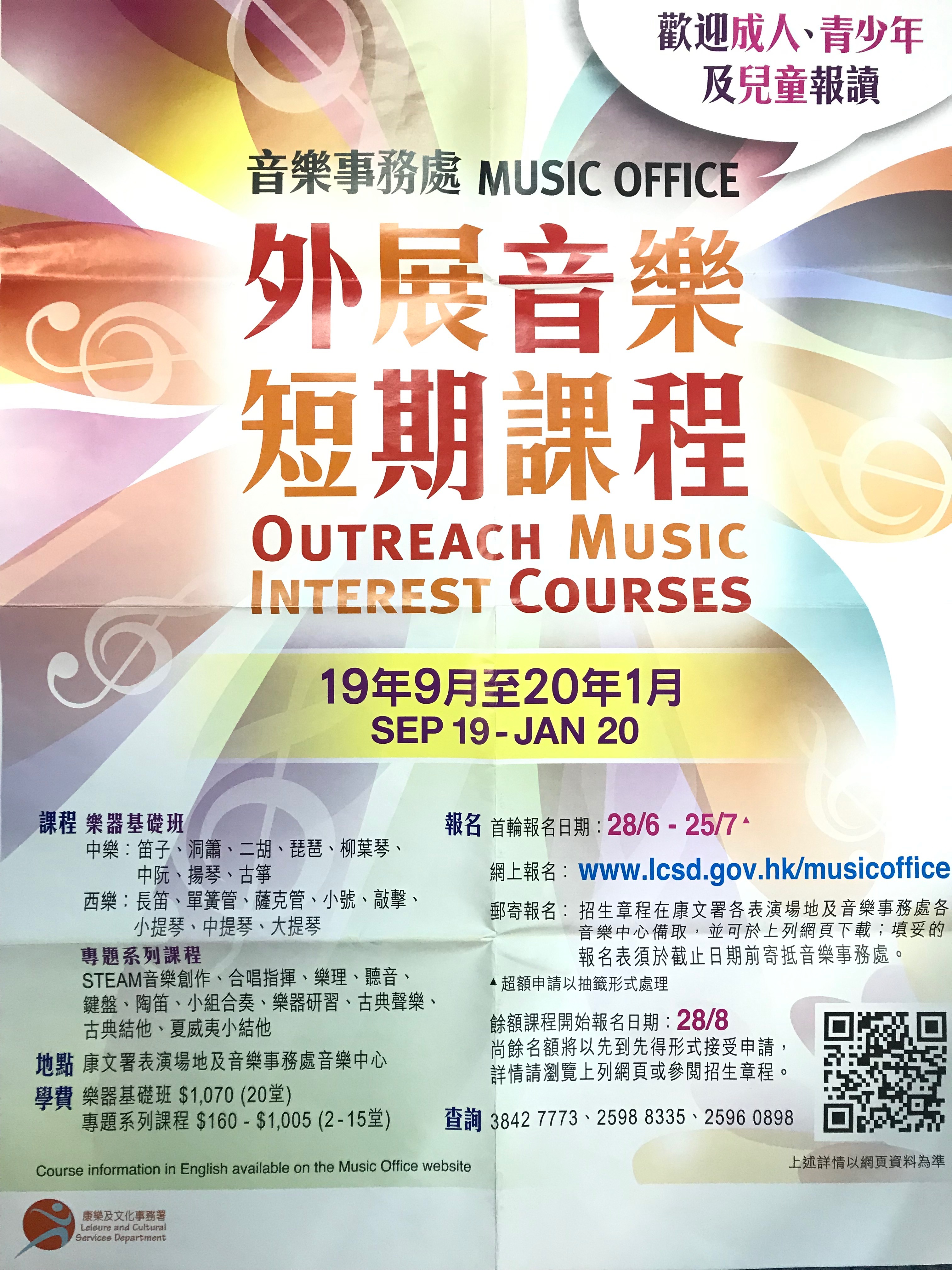 音樂事務處舉辦的「外展音樂短期課程」和「器樂訓練計劃」已接受報名,報名日期如下: