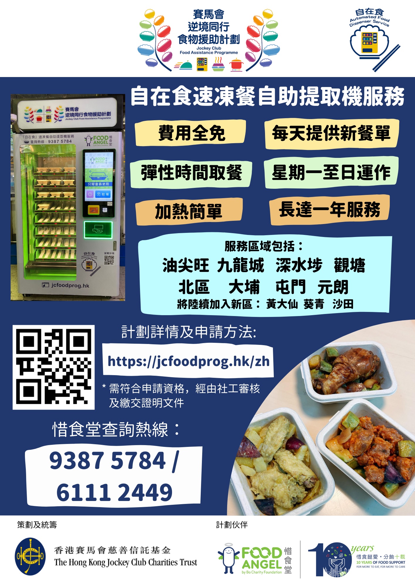 此服務為「賽馬會逆境同行食物援助計劃」其中一項服務, 自助機分佈九龍及新界各區,以創新及更具彈性的取餐方式,為不同作息時間的人士提供速凍餐食物援助服務,以紓緩因疫情衝擊而導致的經濟壓力。