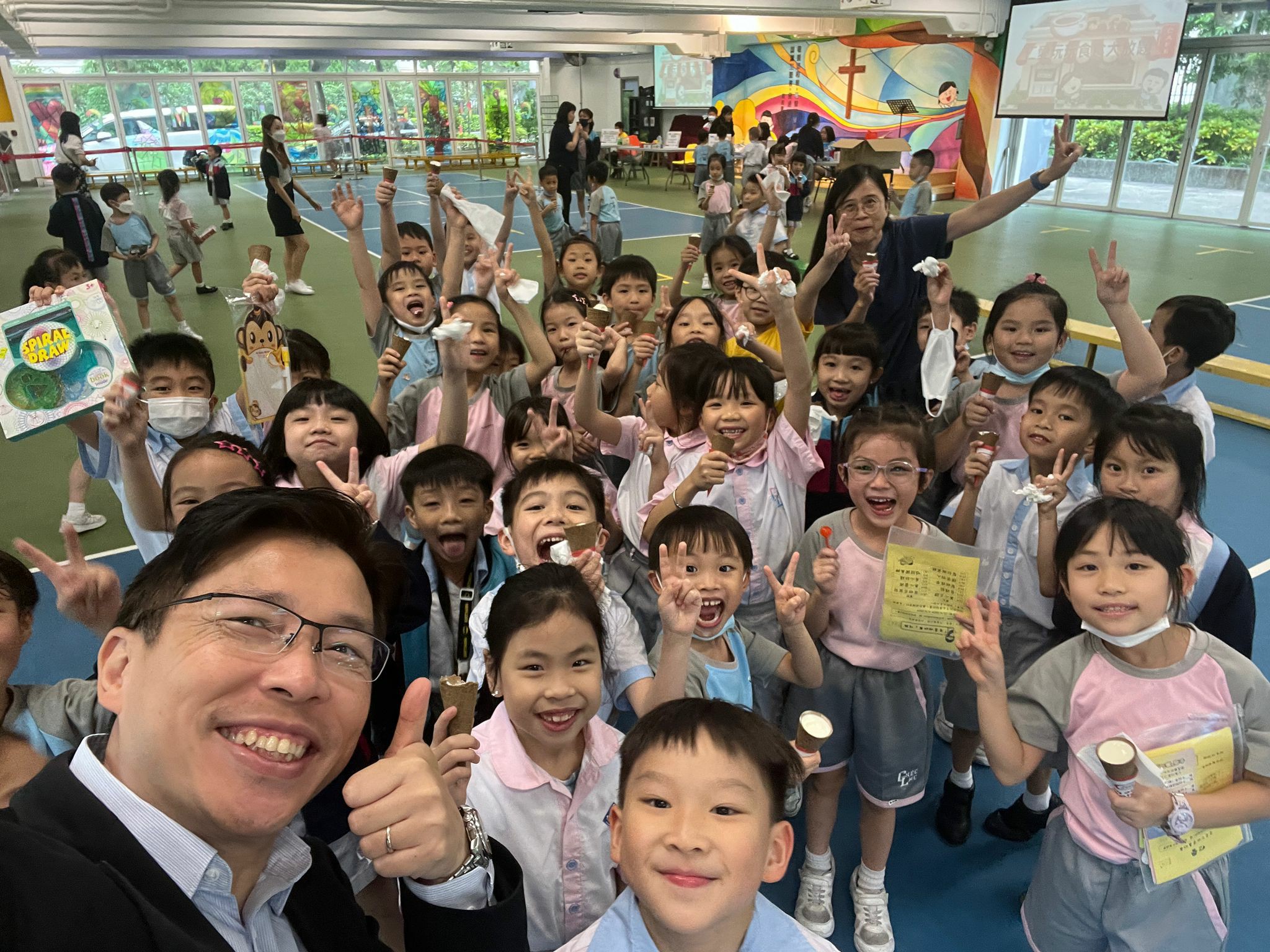 學校於本年度推行「耶穌小精兵計劃」,按聖經真理,培育同學有美善的靈性、良好的品格,生命不斷成長,並以行動服侍別人。第三學段的品格實踐是「做主喜悅的事」、「結出仁愛果子」,喜見同學都積極參與此計劃,同學的仁愛閃卡及耶穌閃卡數量達到指定的數量,便可以在2024年6月5日參加「仁愛玩玩食食大放題」作為奬勵。當天學校安排了大家期待已久的雪糕車到校,得奬的同學可以在炎炎夏日下吃著美味的軟雪糕,顯得十分開心和興奮,此外,有些同學更可選一份自己喜歡的玩具作為奬品,也有部份同學可以玩擲彩虹作為鼓勵。期望各位同學繼續實踐仁愛,正如聖經教導﹕「愛是永不止息。」(哥林多前書13章8節)